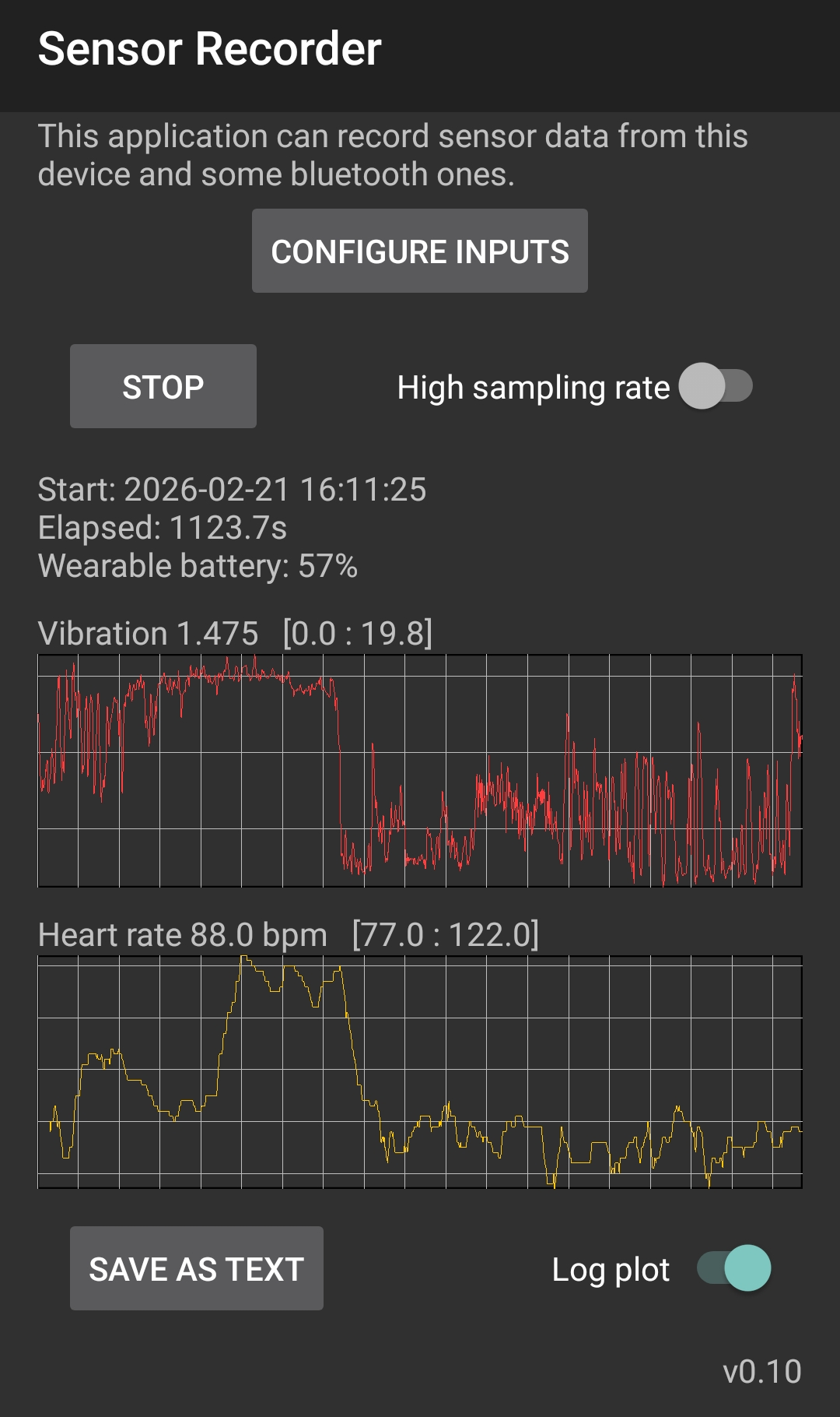 Android application that can continuously record sensors data, show graphs and export in a textual format. I inteded it to track my activity during work outs or sleep, limiting the kind of data recorded. In the future, I might expand it to be of more general utility. Compatible with Android 5.0 and upward.